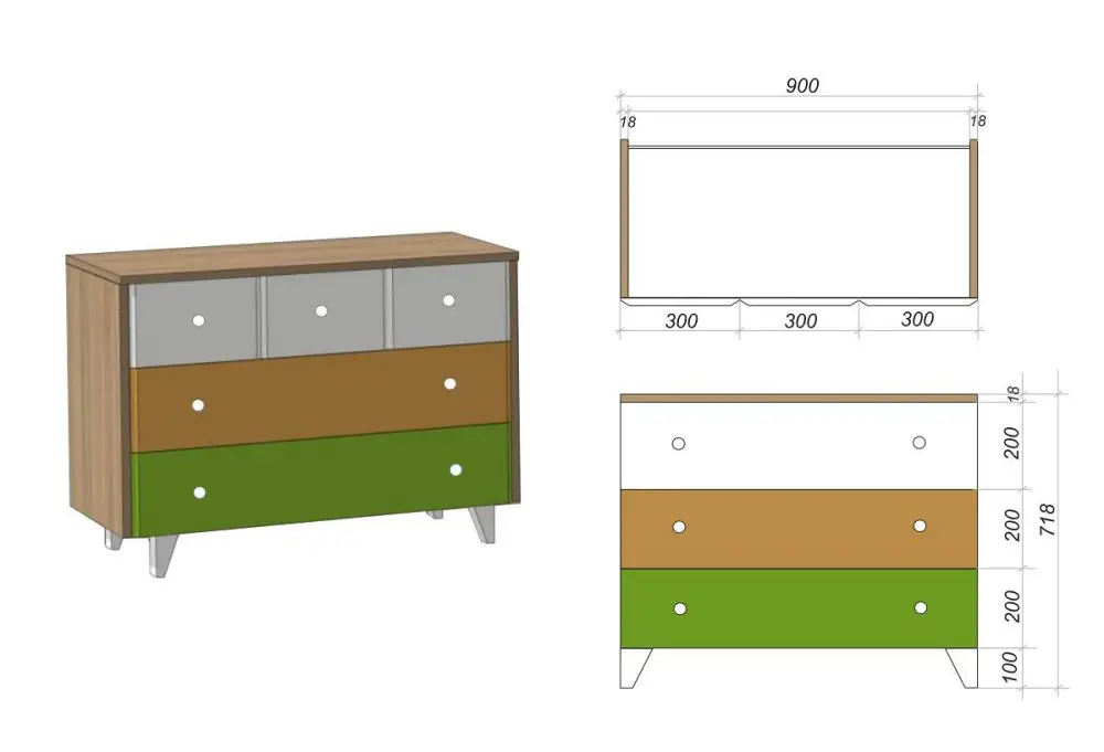Комод изготовлен из ЛДСП 18 мм. лицевые торцы обработаны кромкой ПВХ 2 мм., фасады МДФ/пластик, ножки массив бука. Для ящиков используются шариковые напрявляющие полного выдвижения. Рекомендуем комплектовать с другими модулями из данной серии.