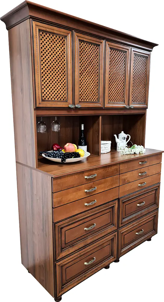 Буфет «Верона» имеет глубокий, благородный цвет, элегантная форма, эстетичная и торжественная мебель, с эффектным и запоминающимся дизайном, станет богатым и почетным украшением домашнего интерьера, наполнив его уютом и практичностью. В верхней секции для хранения посуды дверцы выполнены с перфорированной вставкой, что улучшает воздухообмен внутри шкафа. В нижнем секции располагаются глубокие и вместительные выдвижные ящики. В мебели использована качественная фурнитура европейского качества.