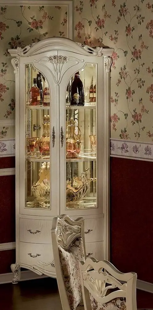Витрина угловая Amelia выполнена в классическом стиле из массива северной березы в шпоне ясеня, покрыта эмалью с нанесением патины. Витрина идеально впишется в угловое пространство, заполняя его по максимуму. Витрина имеет вместительные ящики, дно продублировано красным бархатом, лицевая фурнитура в оттенке золоченное серебро. Глубокий и густой цвет, массивная и элегантная форма, сложная натуральная и экологически чистая мебель Amelia разрабатывалась Миланским дизайн бюро. Вся мебель коллекции выполнена из массива северной березы, в том числе скрытые элементы. Мебель из натурального дерева не выделяет вредных веществ и имеет долгий срок службы. Каждая деталь изделия вырезана вручную, а патина из натурального серебра и изящные линии придают изделиям особенно элегантный и роскошный вид. Дизайн мебели коллекции Amelia исполняется по строгим итальянским технологиям. Разнообразие мебели поможет обустроить любые квадратные метры: гостиную, кухню столовую, кабинет, спальню.