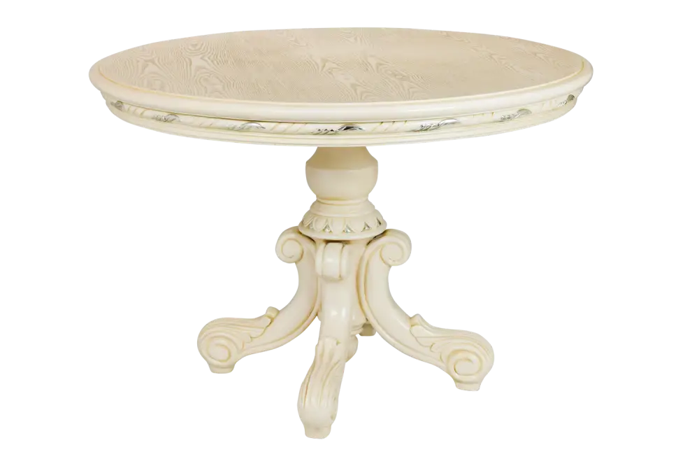 Обеденный стол Margaret создаст атмосферу благородства и роскоши в доме. Круглый стол в классическом стиле из массива северной березы в шпоне ясеня, покрыт эмалью. Резное подстолье подчеркивает легкость и изящество композиции, столешница как будто парит над полом. Пространство под столом увеличено для максимального комфорта. Модель удачно впишется в классические интерьеры. Это прекрасный декоративный элемент, для завершения целостности композиции в едином стиле рококо. Мебель из натурального дерева не выделяет вредных веществ и имеет долгий срок службы. Каждая деталь изделия вырезана вручную, а патина из натурального серебра и нежные изящные линии придают изделиям особенно элегантный и роскошный вид. Разнообразие мебели поможет обустроить любое помещение: гостиную, столовую, кабинет, спальню.