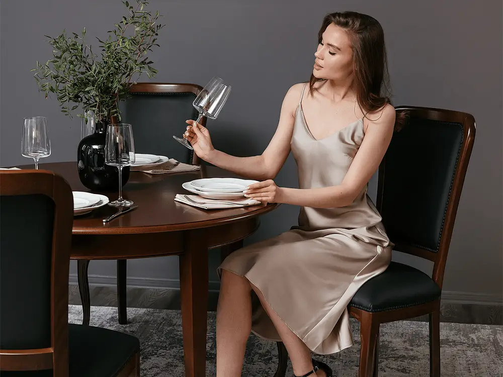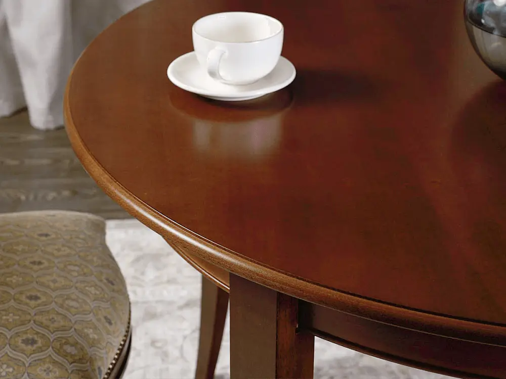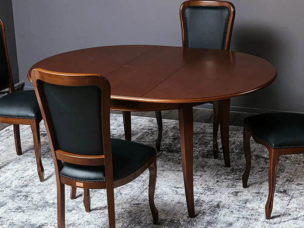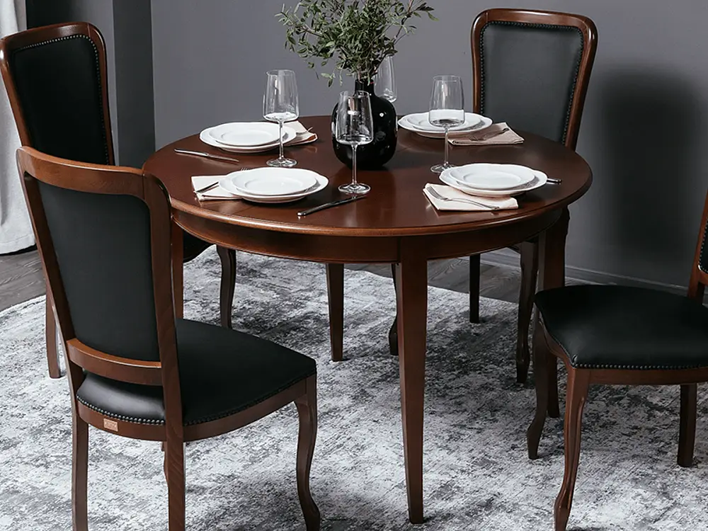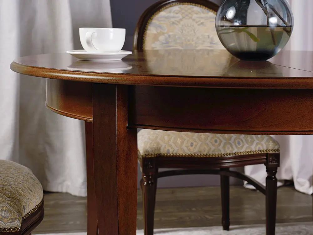 Стол ГРАЦИЯ – яркий образец классического дизайна. Круглая столешница на четырех изящных ножках является оптимальной конструкцией по своей эргономике и надежности, а возможность увечить стол и сделать его овальным, позволит не переживать, если к вам пришли гости и их больше, чем вы планировали. Ножки стола, как и его торец, выполнены из массива бука, столешница выполнена из шпона ореха.