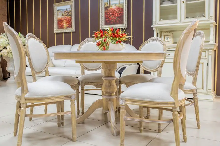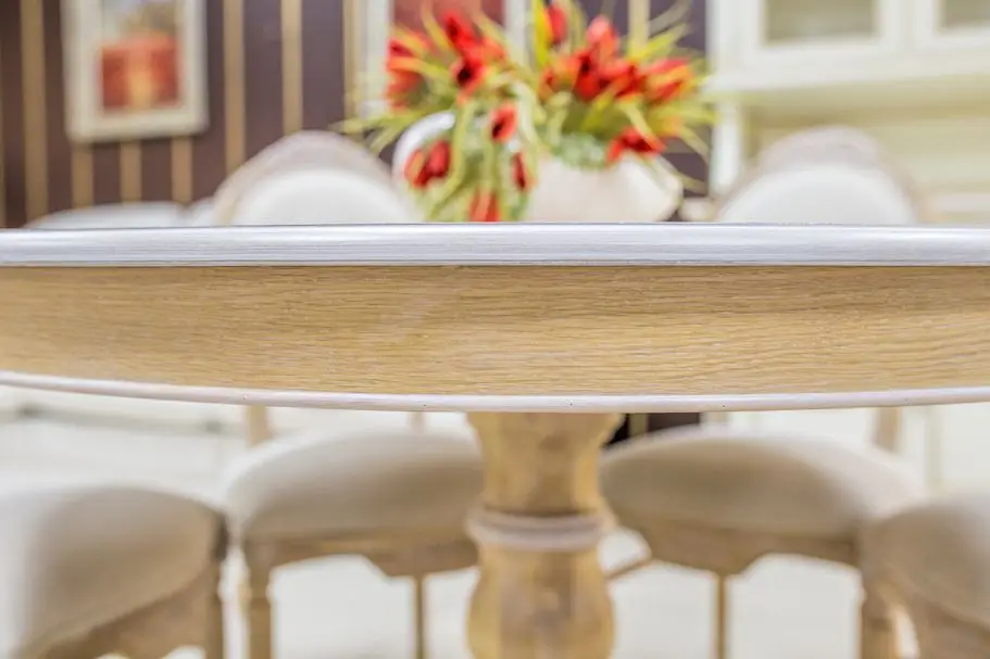 Стол Патриция-2 - яркий образец классического итальянского дизайна. Круглая столешница с на элегантной точёной ножке является оптимальной конструкцией по своей эргономике, а возможность увечить стол и сделать его овальным, позволит не переживать, если к вам пришли гости и их больше, чем вы планировали. Ножка стола, как и его торец, выполнены из массива бука, опорные ножки балясины дополнительно декорированы фрезеровкой, что при нанесении патины подчеркивает элегантность форм. Столешница выполнена из шпона дуба, текстуру которого также подчеркивает патина.