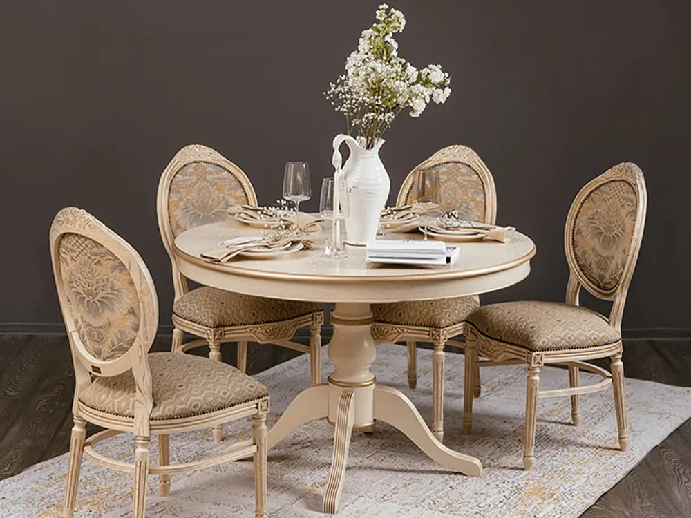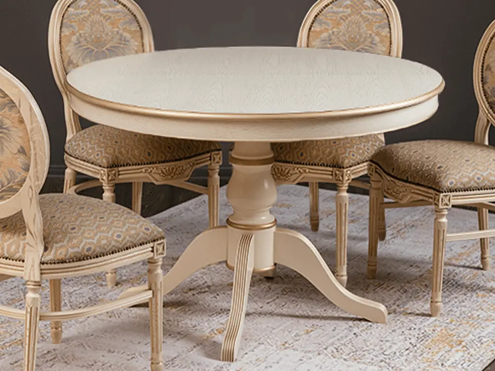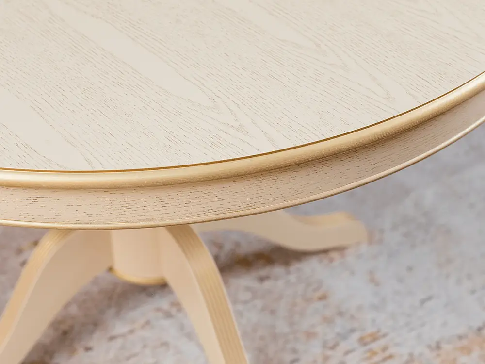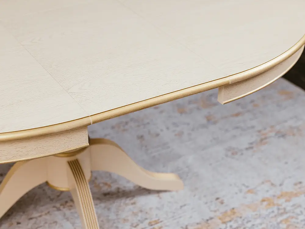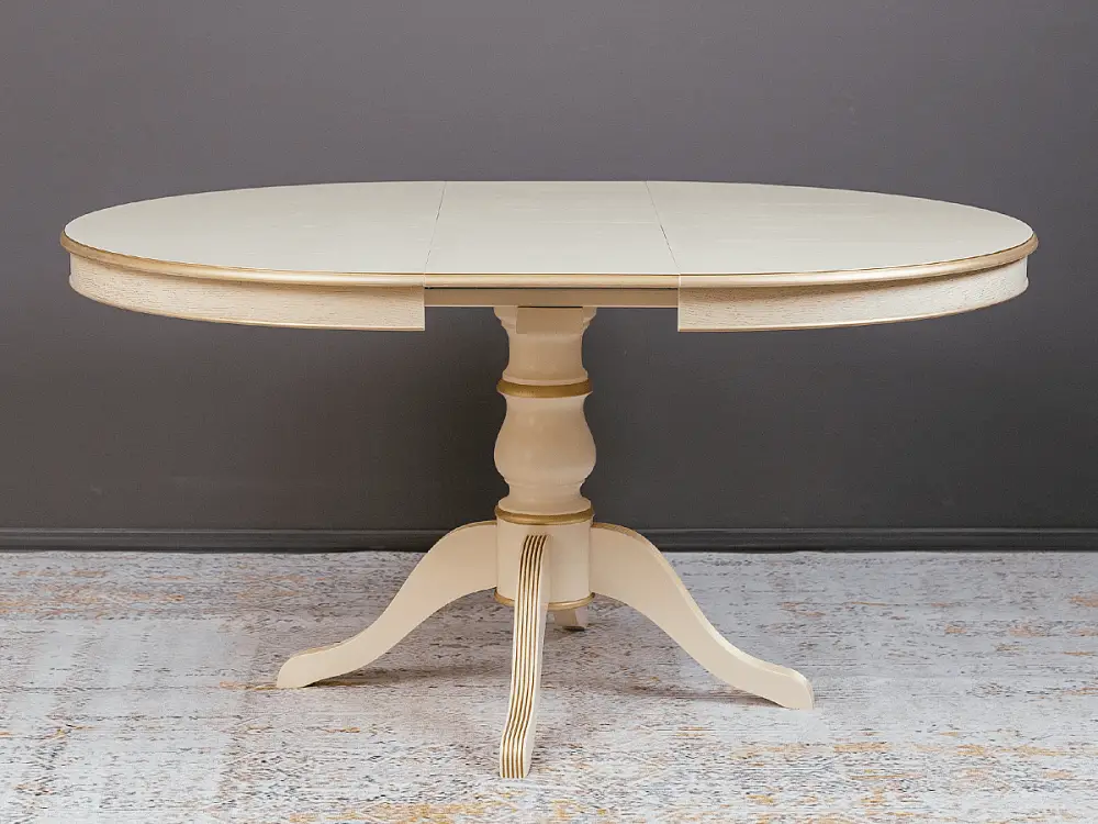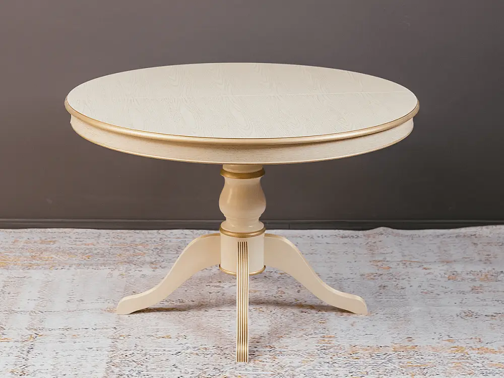 Стол обеденный, круглый раздвижной ПАТРИЦИЯ-2 (1000-1340)х1000,мдф в шпоне дуба окрашен эмалью эмаль слоновая кость , патина золото