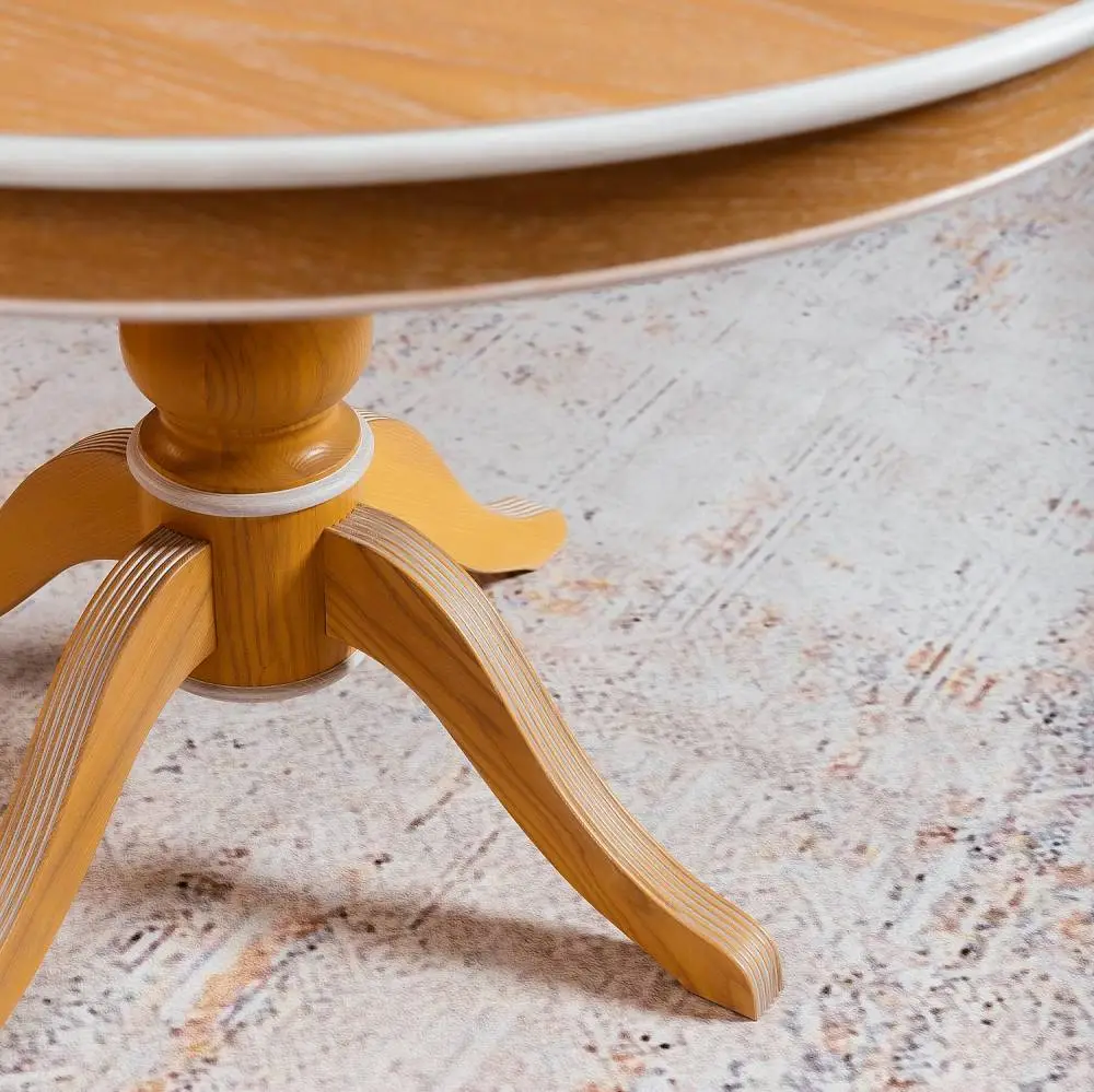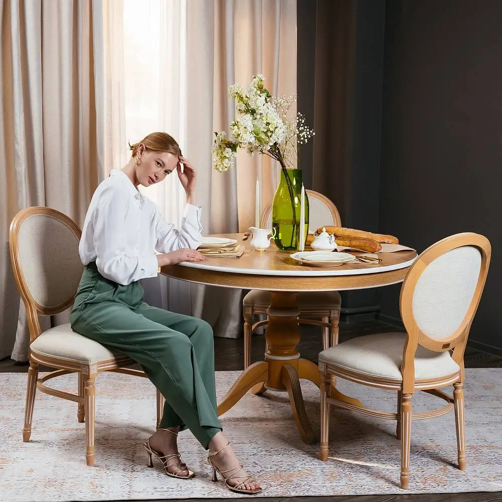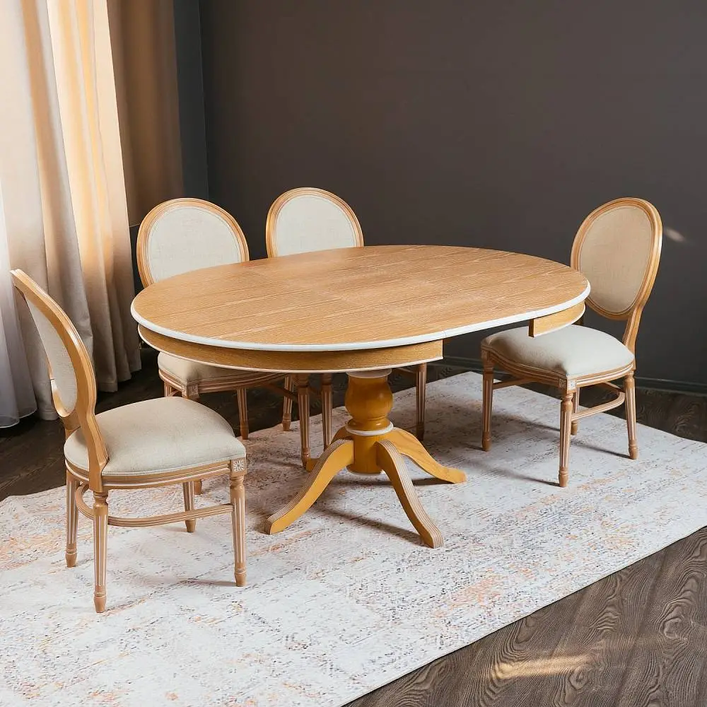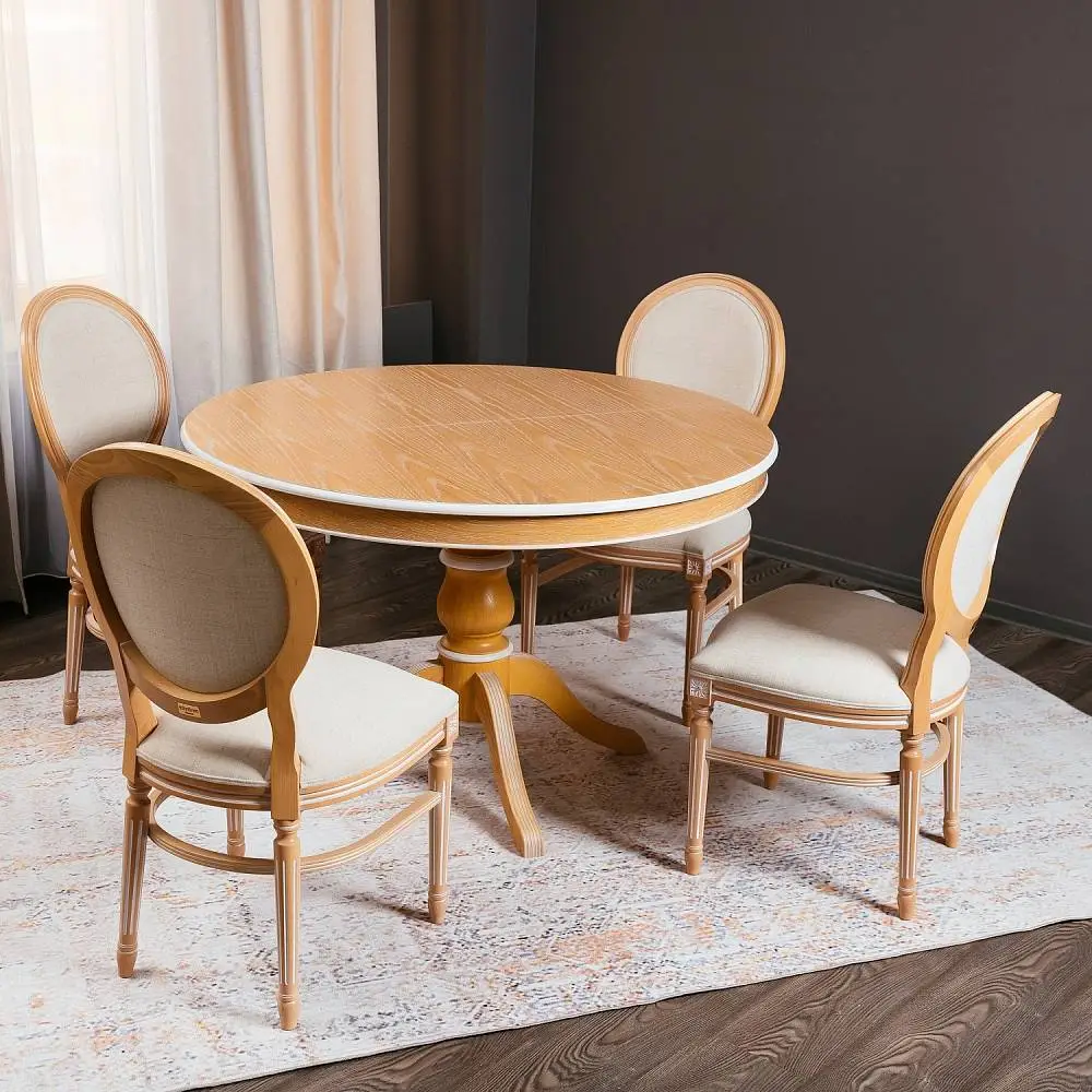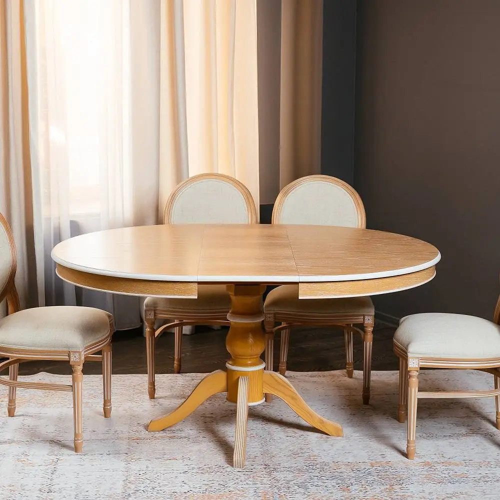 Стол Патриция-2 - яркий образец классического итальянского дизайна. Круглая столешница с на элегантной точёной ножке является оптимальной конструкцией по своей эргономике, а возможность увечить стол и сделать его овальным, позволит не переживать, если к вам пришли гости и их больше, чем вы планировали. Ножка стола, как и его торец, выполнены из массива бука, опорные ножки балясины дополнительно декорированы фрезеровкой, что при нанесении патины подчеркивает элегантность форм. Столешница выполнена из шпона дуба, текстуру которого также подчеркивает патина.