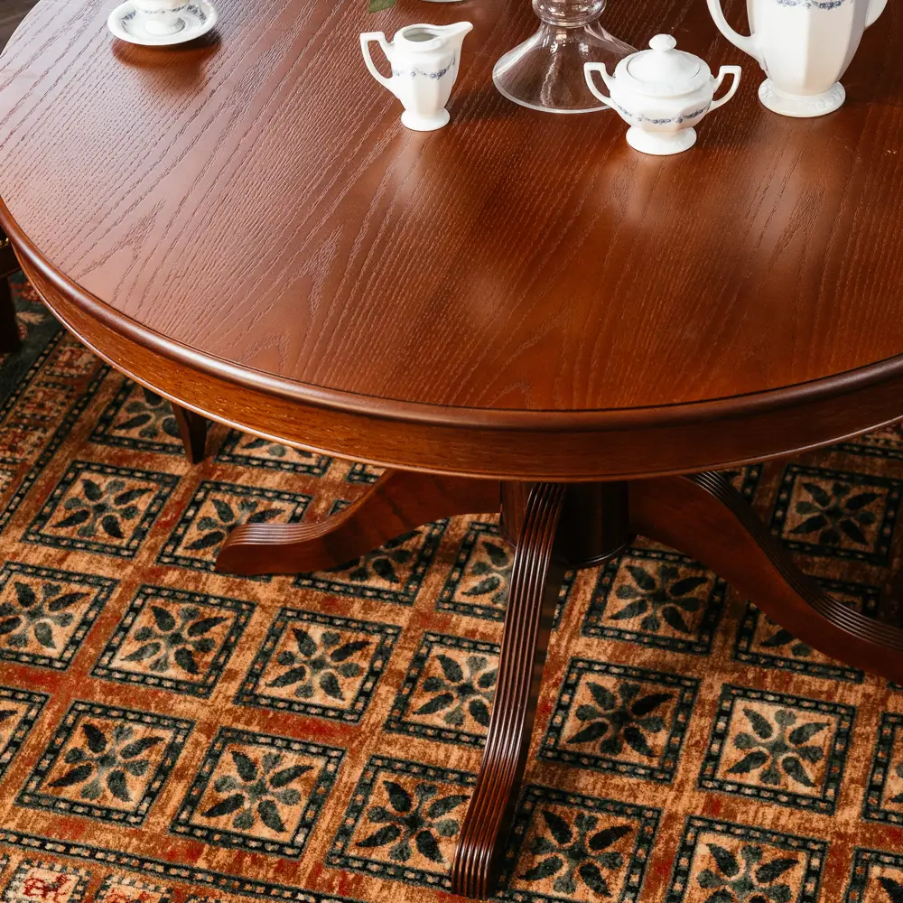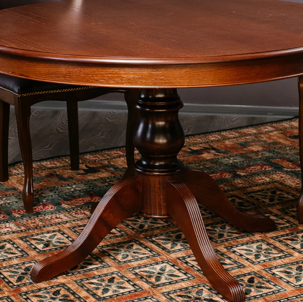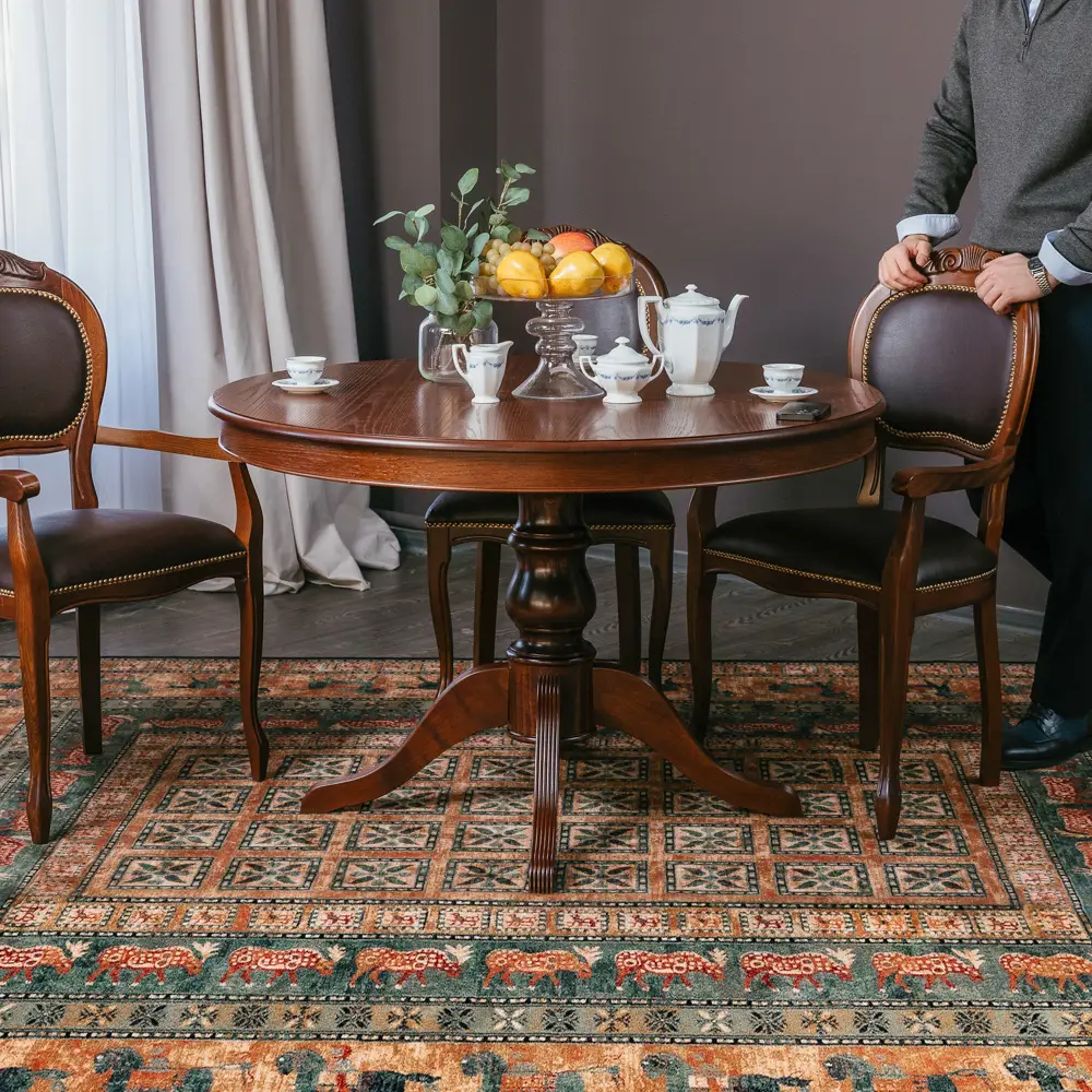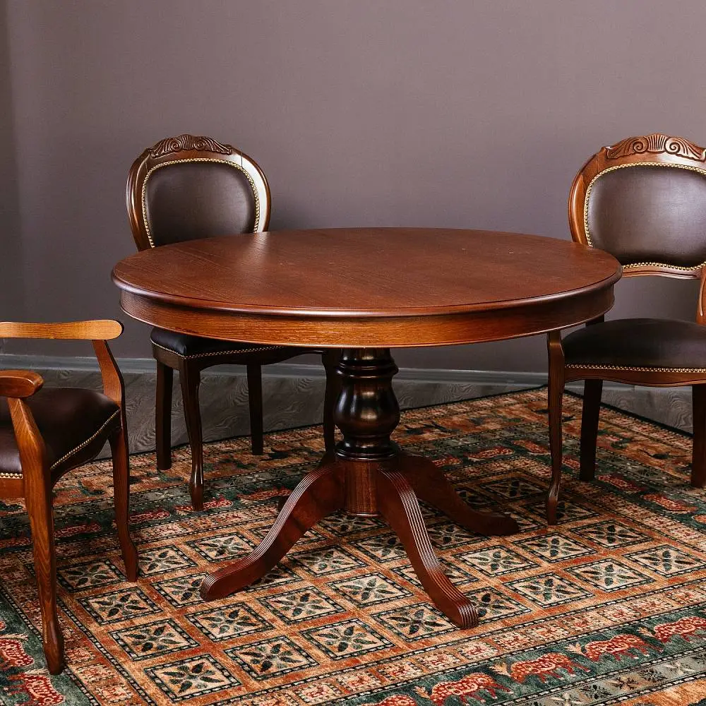 Стол ПАТРИЦИЯ-2 – это яркий образец классического итальянского дизайна. Круглая столешница с на элегантной точёной ножке является оптимальной конструкцией по своей эргономике. Стол можно разложить и сделать его овальным, и не переживать, если к вам пришли гости и их больше, чем вы планировали. Нога-опора стола и край столешницы выполнены из массива бука. Лепестки-опоры дополнительно декорированы фрезеровкой-гребенкой и патиной, что подчеркивает элегантность форм. Поверхность столешницы покрыта шпона дуба, текстуру которого также подчеркивает патина.