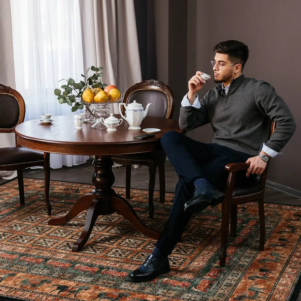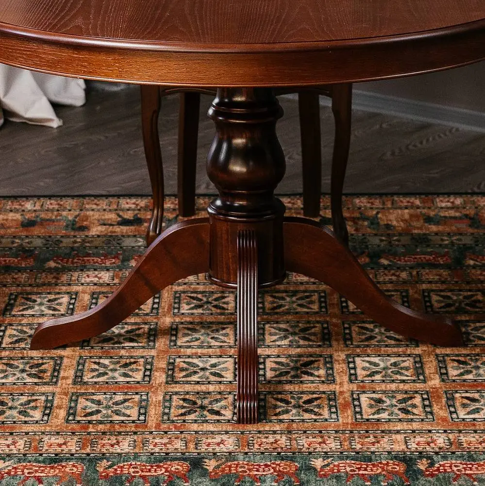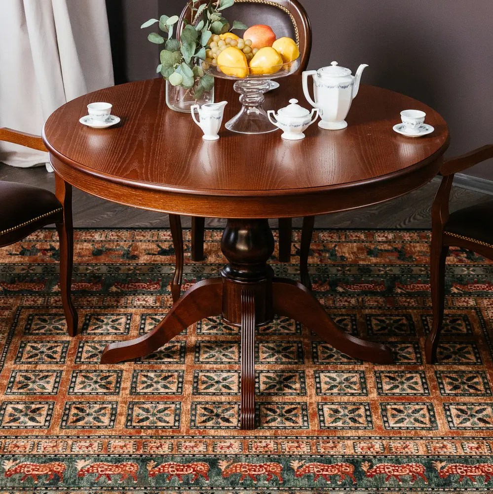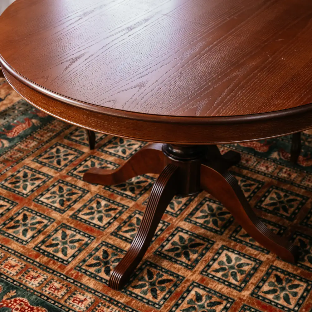 Стол ПАТРИЦИЯ-2 – это яркий образец классического итальянского дизайна. Круглая столешница с на элегантной точёной ножке является оптимальной конструкцией по своей эргономике. Стол можно разложить и сделать его овальным, и не переживать, если к вам пришли гости и их больше, чем вы планировали. Нога-опора стола и край столешницы выполнены из массива бука. Лепестки-опоры дополнительно декорированы фрезеровкой-гребенкой и патиной, что подчеркивает элегантность форм. Поверхность столешницы покрыта шпона дуба, текстуру которого также подчеркивает патина.