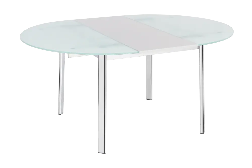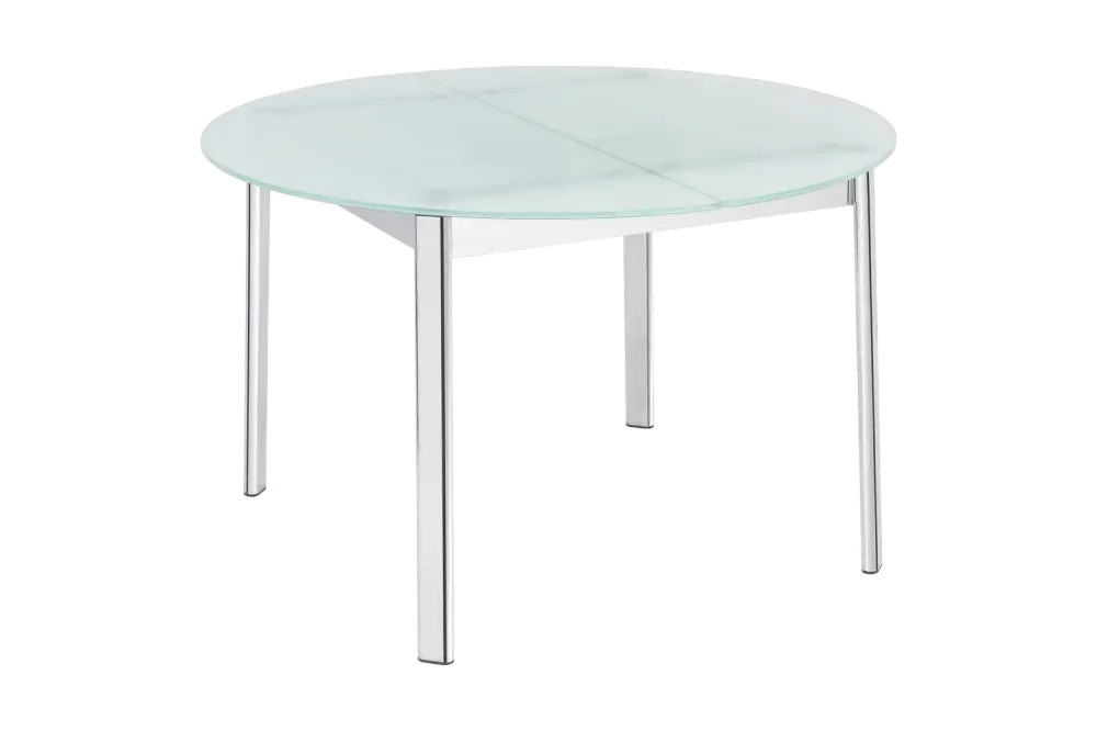 Круглая столешница выполнена из закаленного стекла, ножки из хромированной стали.