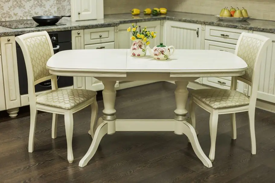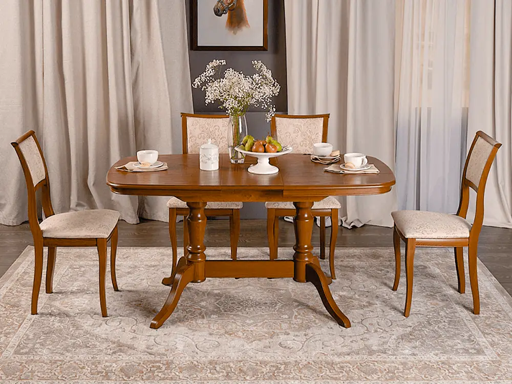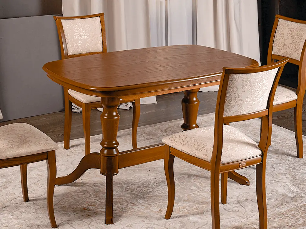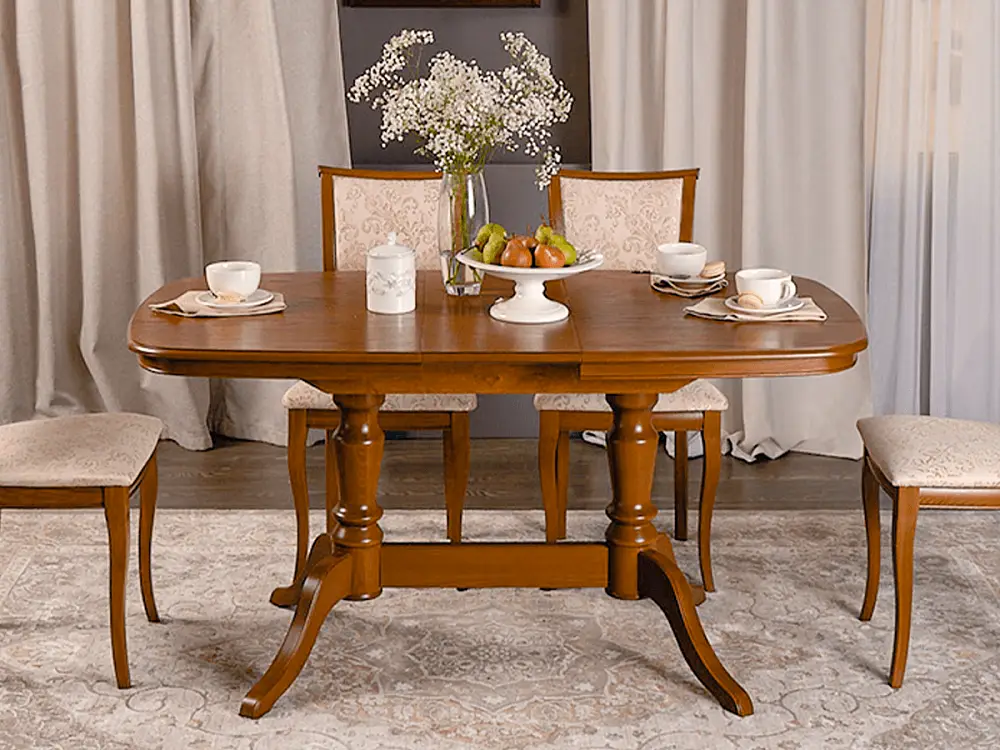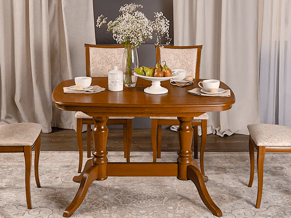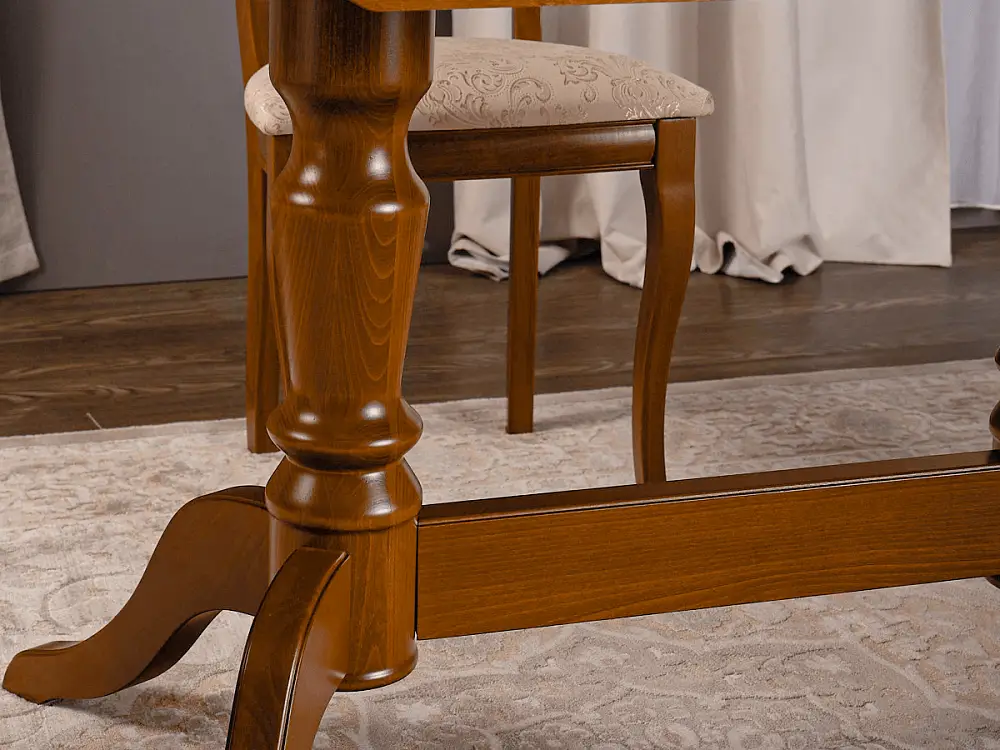 Стол обеденный СОФИЯ-2 выполнен из натурального дерева в традиционном классическом стиле. Это небольшой, но основательный и надежный кухонный стол на двух ножках, а его отличительным качеством является правильная форма столешницы эргономичной формы без острых углов. Отсутствие острых углов сделает эксплуатацию такого стола обеденного раздвижного безопасной. Несомненный плюс стола кухонного София-2 это – устойчивая конструкция ножек, при которой вес стола распределяется на две прочные опоры, усиленные соединительной царгой. Цвет столешницы стола кухонного раздвижного сочетается с любым декором, а деревянные опоры с патиной подчеркнут стиль вашего интерьера. Мебель от производителя бренда Alpina Market изготовлена на российской мебельной фабрике Alpina, которая работает по итальянским технологиям. Автоматизированные процессы и кропотливый ручной труд позволяют создавать уникальные кресла и стулья, мебель для квартиры, дачи, дома высокого качества.