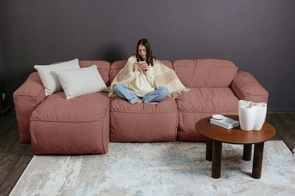 Диван имеет несколько модулей, которые можно переставлять. Это очень практично, поскольку можно составлять бесчисленные комбинации любой формы. Это может быть угловой диван, кресло или высокий пуф.