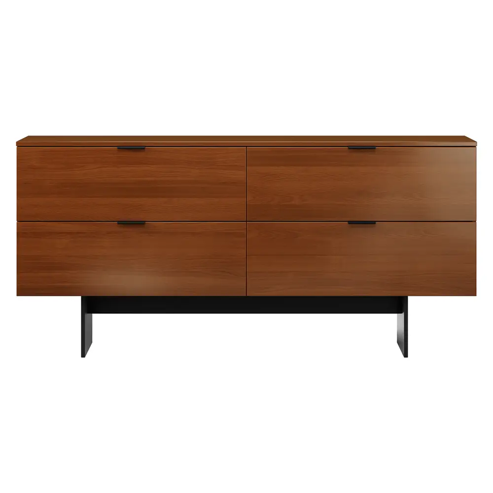 Комод ASPARO в оттенках бренди, пломбир и венге с черными акцентами станет отличным дополнением к современному интерьеру и стилю лофт. Фасады, шпонированные ценными породами дерева, сохраняют текстуру натурального материала. Прямолинейные опоры и черная фурнитура создают строгий и лаконичный образ. Внутренние направляющие скрытого монтажа с доводчиком обеспечивают плавное и бесшумное закрывание ящиков. Четыре просторных ящика идеально подойдут для хранения офисных и кабинетных принадлежностей. Также комод можно использовать как ТВ-тумбу или буфет для хранения посуды.