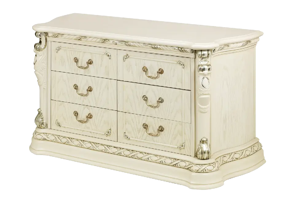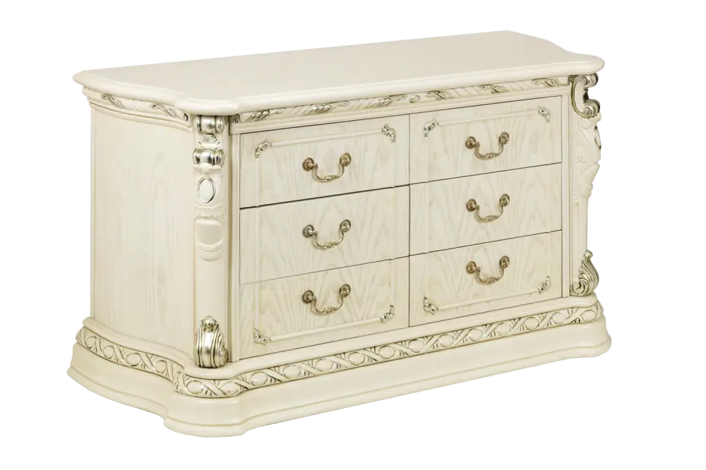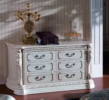 Комод с ящиками Margaret создаст атмосферу благородства и роскоши в доме. Выполнен в классическом стиле из массива северной березы в шпоне ясеня, покрыт эмалью. Деревянный комод имеет 6 вместительных ящиков, дно продублировано красным бархатом, выкатной механизм позволяет выдерживать высокую нагрузку до 10 кг. Вся мебель коллекции Margaret выполнена из массива северной березы, в том числе скрытые элементы. Мебель из натурального дерева не выделяет вредных веществ и имеет долгий срок службы. Каждая деталь изделия вырезана вручную, а патина из натурального серебра и нежные изящные линии придают изделиям элегантный и роскошный вид. Дно выдвижных ящиков покрыто бархатом, чтобы предметы не скользили. Коллекция Margaret исполняется в классическом стиле рококо по итальянским технологиям. Разнообразие мебели поможет обустроить любое помещение: гостиную, столовую, кабинет, спальню. Качественная фурнитура DTC в цвете Античная бронза. Петли комода из дерева рассчитаны на 100 000 циклов открывания.
