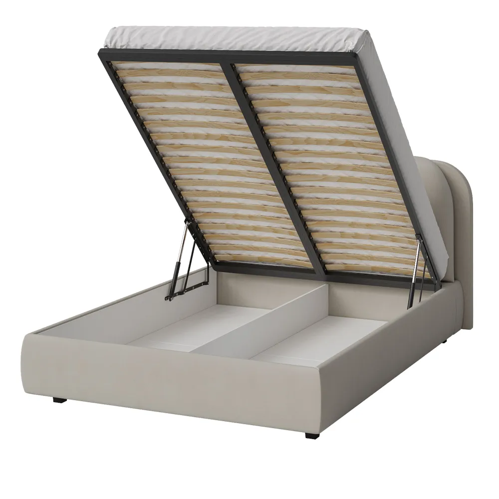 Элегантная и современная кровать. Благодаря продуманной конструкции изголовья, кровать превращается в многофункциональную зону отдыха, где можно не только спать, но и наслаждаться любимыми занятиями в комфортных условиях: вечернее чтение при мягком освещении, просмотр любимых сериалов, разговоры по телефону, утренний кофе в постели. Изножье имеет закругленные углы для дополнительной безопасности и эстетики. Кровать производится в нескольких вариантах тканей: из мягкого велюра, уютного букле и практичной рогожки. Все ткани отличаются исключительной мягкостью, высокой стойкостью к истиранию и легкостью в уходе. Ортопедическое основание изготовлено из прочной березовой фанеры, которое способствует правильному положение позвоночника во время сна и обеспечивает комфортный отдых. Подъемный механизм оснащен газлифтами, позволяющими легко и бесшумно открывать и закрывать спальное место. Вместительный бельевой ящик предоставляет достаточно пространства для хранения. Подушка-шар в комплект не входит.