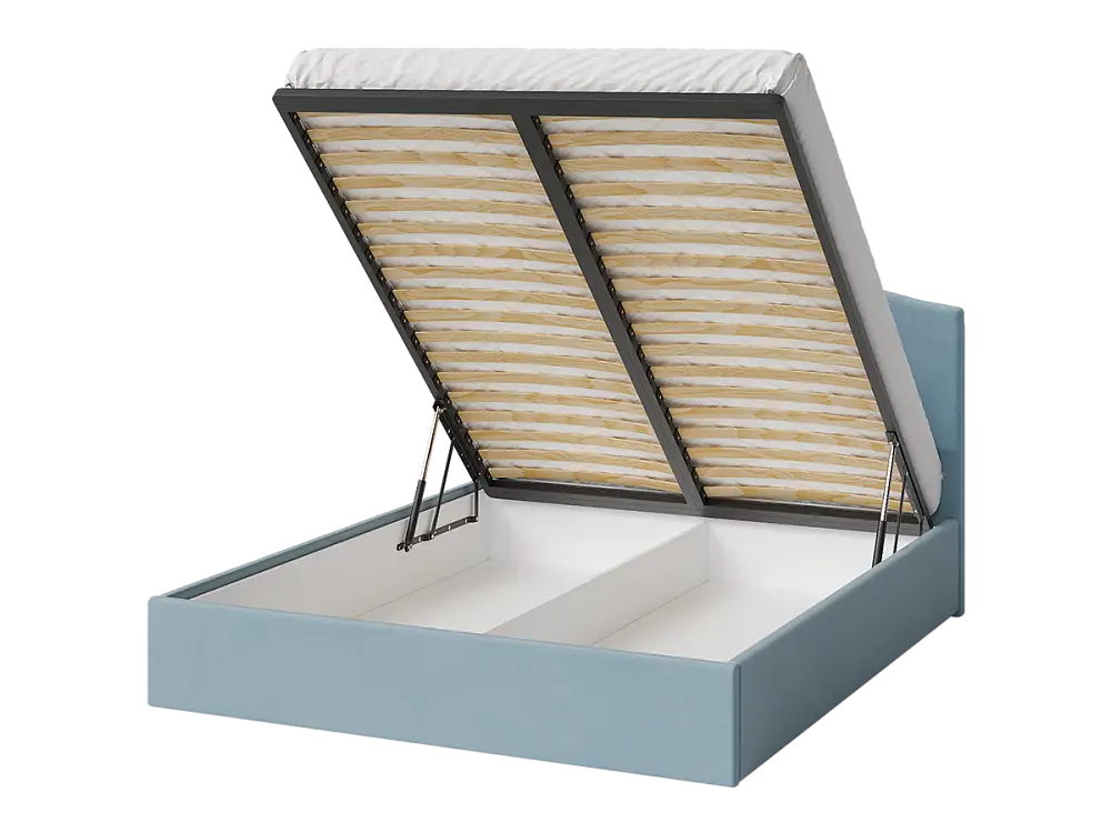 Ортопедическое основание изготовлено из прочной березовой фанеры. Подъемный механизм оснащен газлифтами, позволяющими легко и бесшумно открывать и закрывать спальное место. Вместительный бельевой ящик предоставляет достаточно пространства для хранения