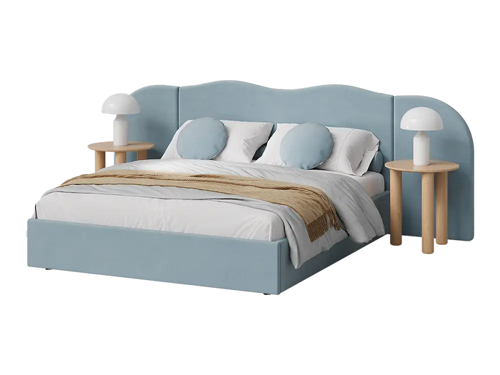 Кровать двуспальная мягкая ONDUTTO, широкое изголовье волна 160х200 с подъемным механизмом и ящиком для хранения голубой