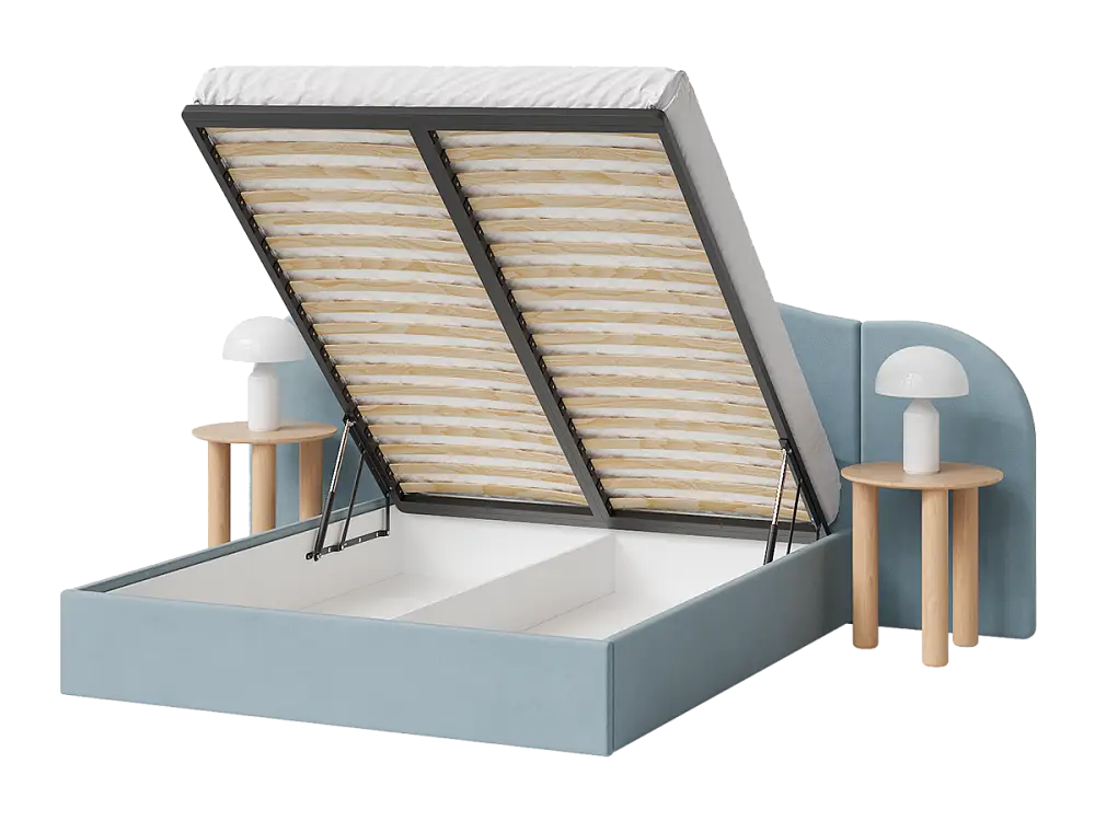 Ортопедическое основание изготовлено из прочной березовой фанеры. Подъемный механизм оснащен газлифтами, позволяющими легко и бесшумно открывать и закрывать спальное место. Вместительный бельевой ящик предоставляет достаточно пространства для хранения