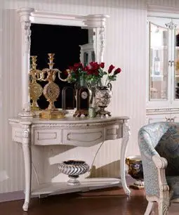 Консольное зеркало Margaret создаст роскошную и романтичную атмосферу дворцовой Франции, станет украшением интерьера, наполнив его уютом и роскошью. Зеркала выполнены из массива северной березы в шпоне ясеня, покрыты эмалью, патиной. Зеркало выполнено без эффекта искажения отражения. Оклад из резного массива, колоны из березы, по периметру обработано по технологии шлифования. Широкий фацет подчеркивает классический стиль. Вся мебель коллекции выполнена из массива северной березы, в том числе скрытые элементы. Мебель из натурального дерева не выделяет вредных веществ и имеет долгий срок службы. Каждая деталь изделия вырезана вручную, а патина из натурального серебра и нежные изящные линии придают изделиям особенно элегантный и роскошный вид. Дизайн зеркал коллекции Margaret исполняется в классическом стиле по строгим итальянским технологиям. Разнообразие мебели поможет обустроить любые жилые квадратные метры: гостиную, кухню столовую, кабинет, спальню.